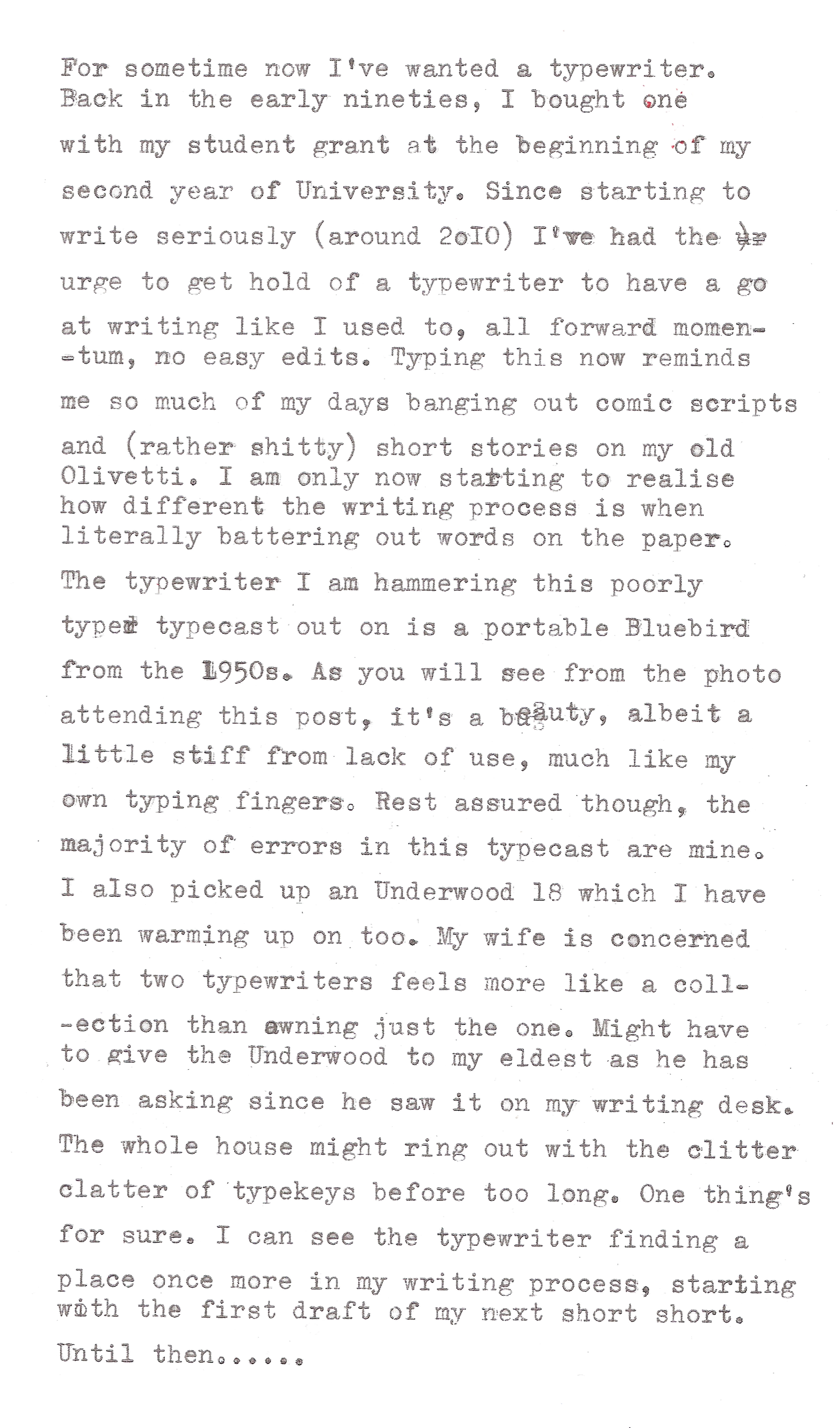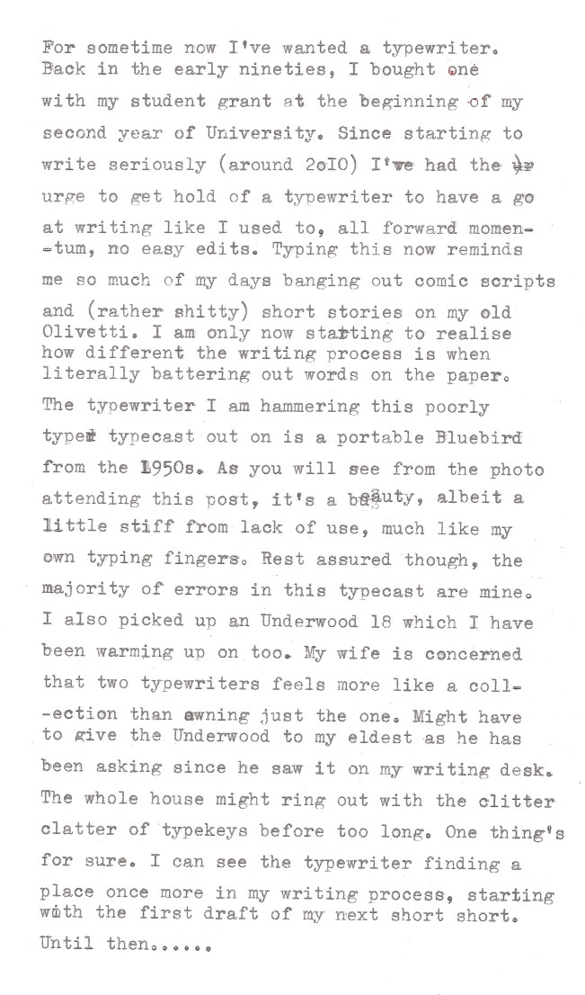 Along the way I stumbled across the typecasting flavour of blogging and decided to give it a go myself. My apologies for the typos, still finding my feet fingers again after too many years without a typewriter.The following was typed on this little beauty, a Bluebird from the 1950s: