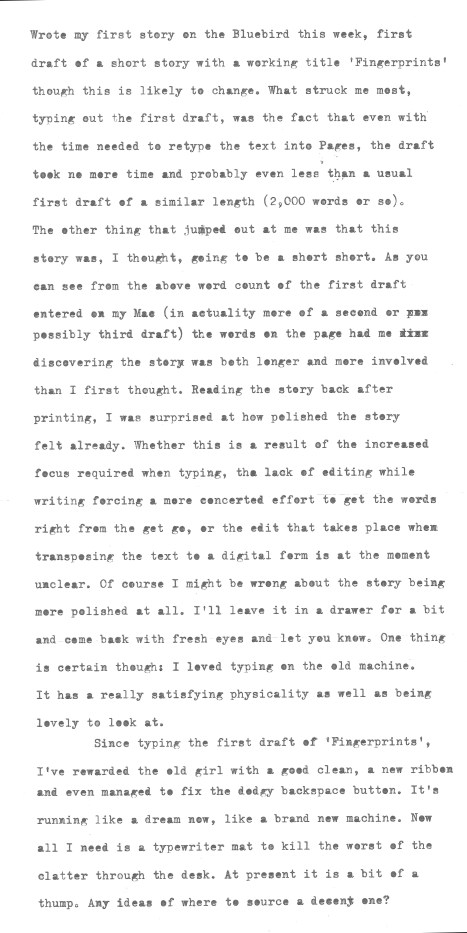 TBH there probably was more than a little nostalgia behind my buying a new old typewriter. That said, having used it a few times now it is fast becoming my primary tool for first drafts. You should have a look on ebay, lots of decent machines for next to nothing. The Bluebird cost £5 plus postage.