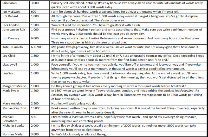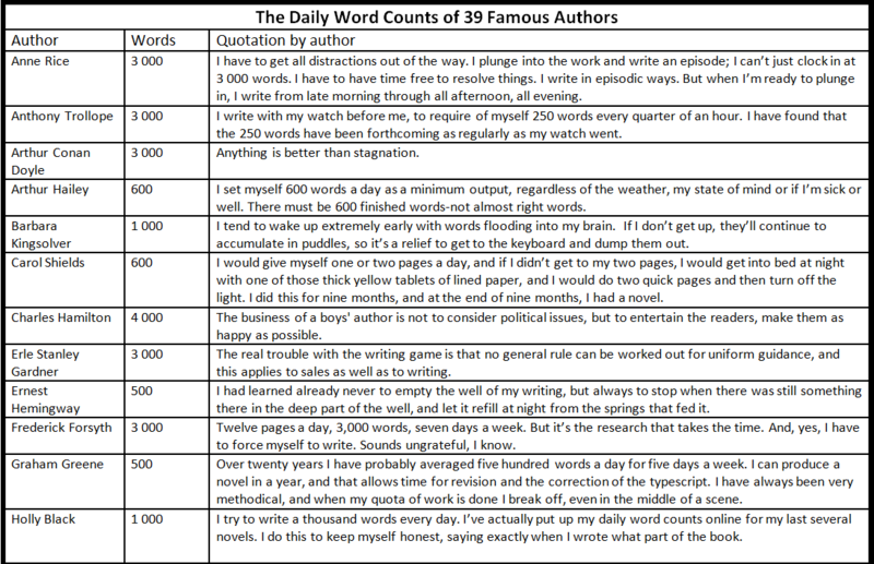 Over on Writers Write, Amanda Patterson recently blogged concerning ‘The Daily Word Counts of 39 Famous Authors.’ The table compiled there, which I reproduce below, is a fascinating insight into the comparative daily outputs of some of the most well know writers of the last hundred years or more. What quickly becomes apparent is that there are no right or wrong answers here, but merely what best suits the individual author.