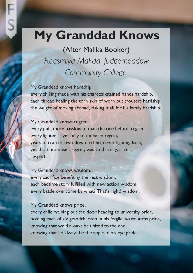 Raasmiya’s response is a heartfelt tribute to her grandfather and when she read the first draft to the group in the original workshop it moved all of us there. I am so glad she worked on the poem and chose to include it in Judgemeadow Community College’s forthcoming collection of work ‘I right Inglish goodlyer then U’. The anthology of the students’ work is a wonderful mix of poetry and prose and I am very proud to have played a small part in helping them create such a great collection of writing.
